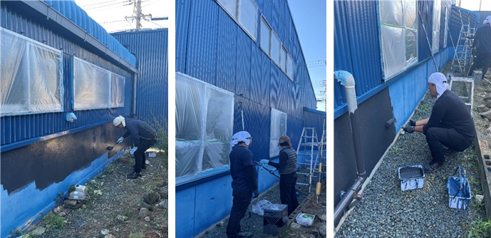 現在は稼働に向けて 準備の真っ最中なのですが、その工場の建屋の外壁塗装は管理職をはじめ 当社の社員で行ってます。